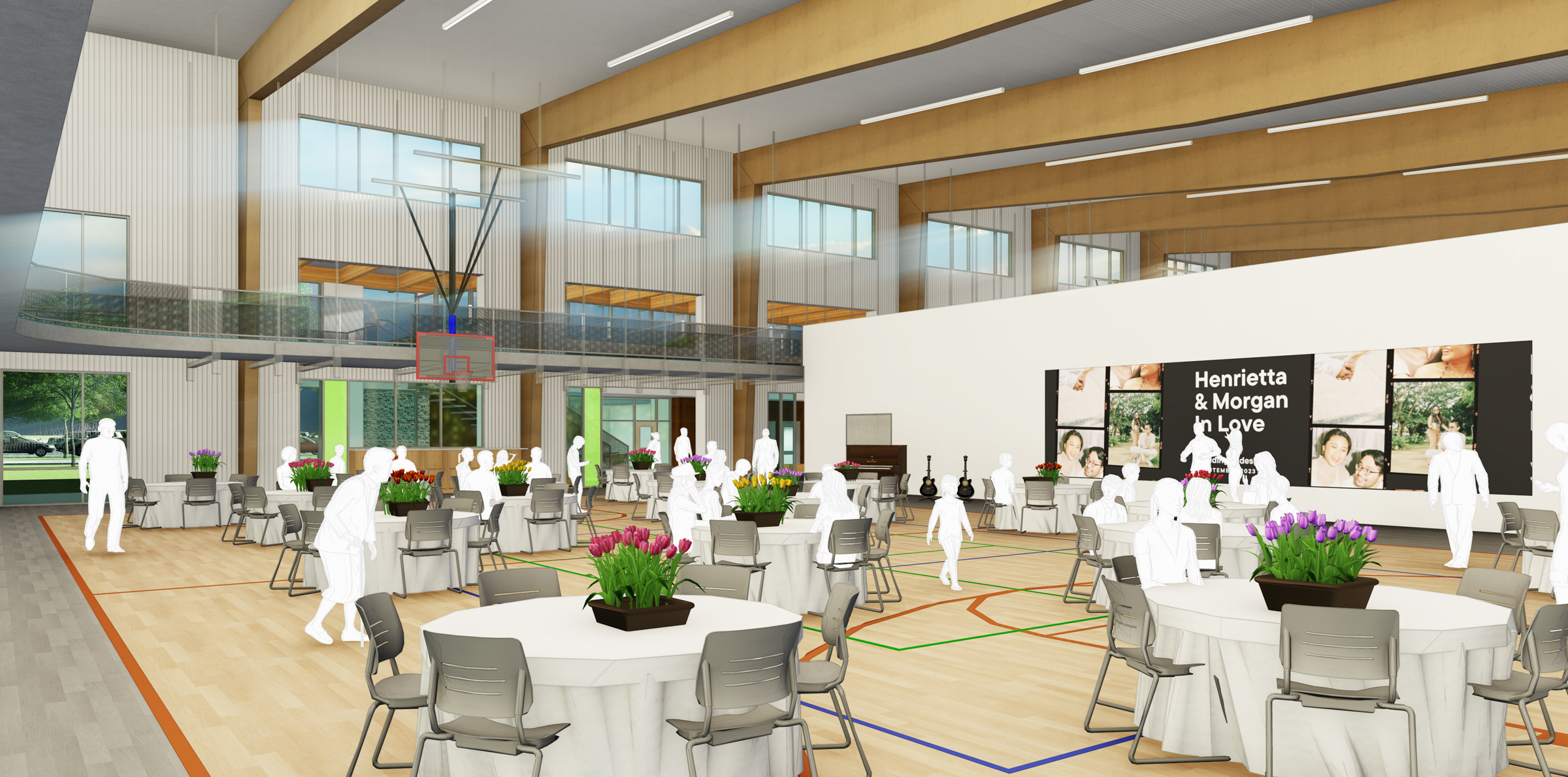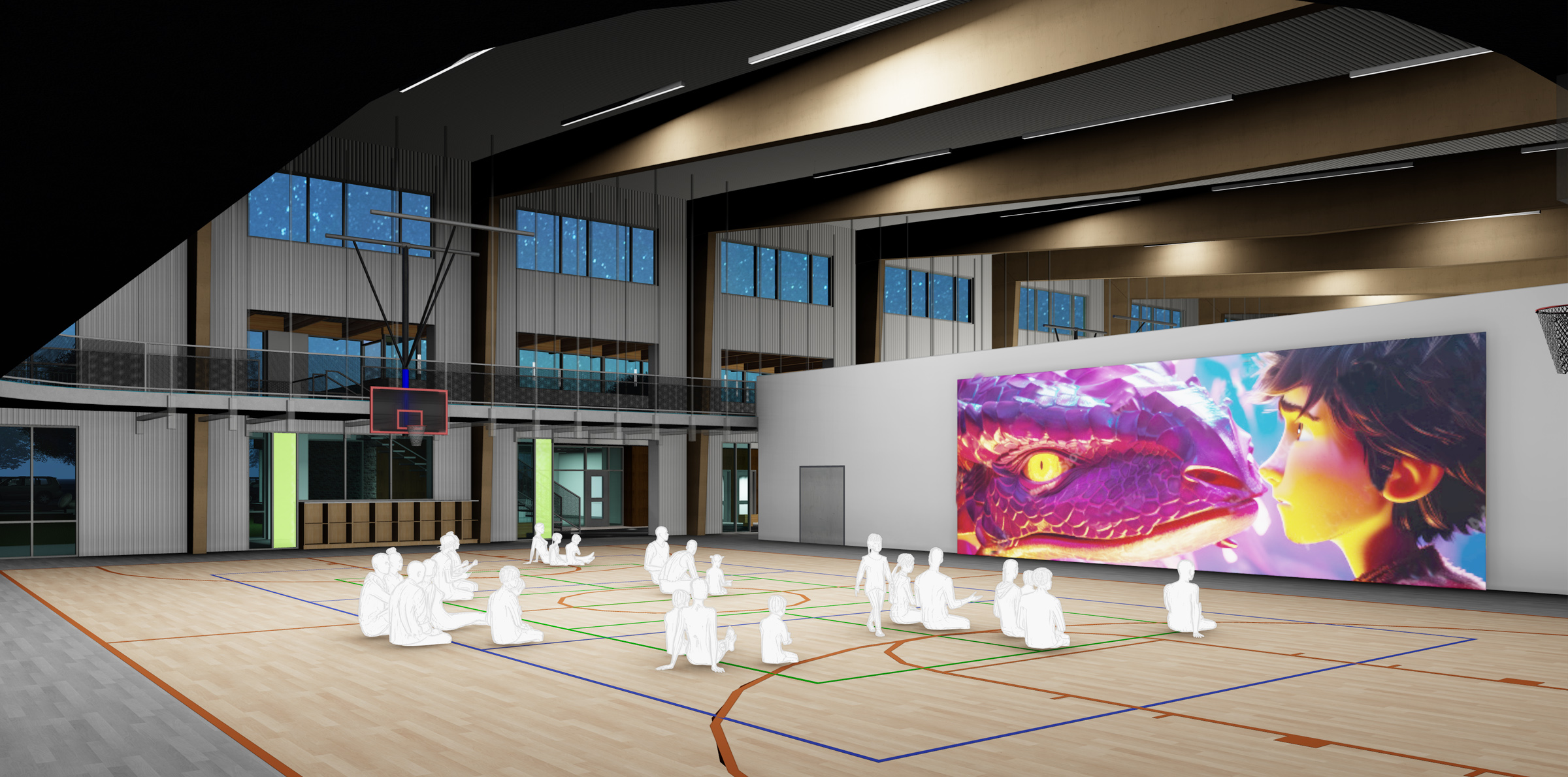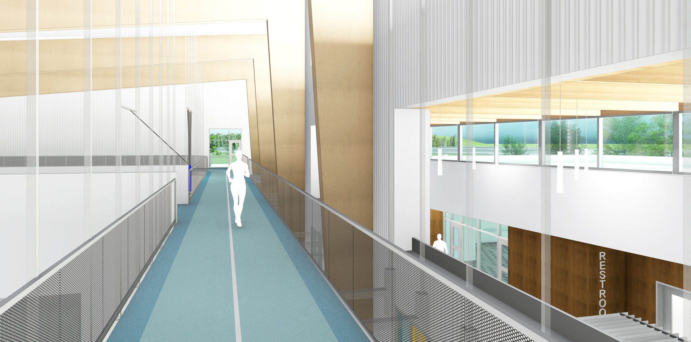 The gymnasiums take up nearly two-thirds of the footprint, consisting of three basketball courts, bleachers, and large storage. A running track floats above, following the perimeter of the gym. Daylight is brought into the facility through large windows from the north and south.